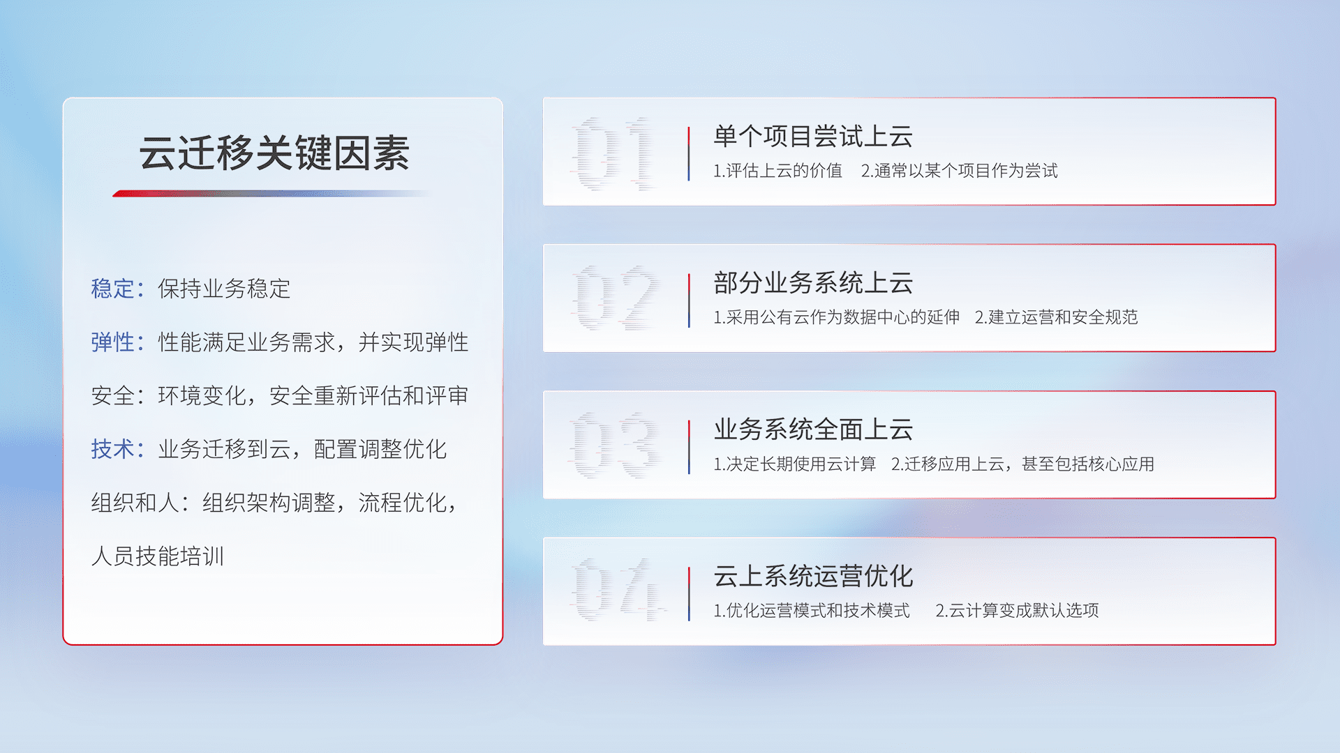 结合实际业务,,,,从规划设计、、、云平台选型、、云原生改造、、、、数据迁移、、集成交付,,迁移全过程为客户识别最佳上云路径,,做好风险识别管理,,设计网络架构、、身份权限、、安全审计合规、、操作审计、、、日志审计、、、、监控告警策略、、、多站点容灾设计等,,,,对云上基础设施进行整体规划,,,,提升IT治理水平,,,以满足弹性、、、、高可用、、高性能的需求。。。。