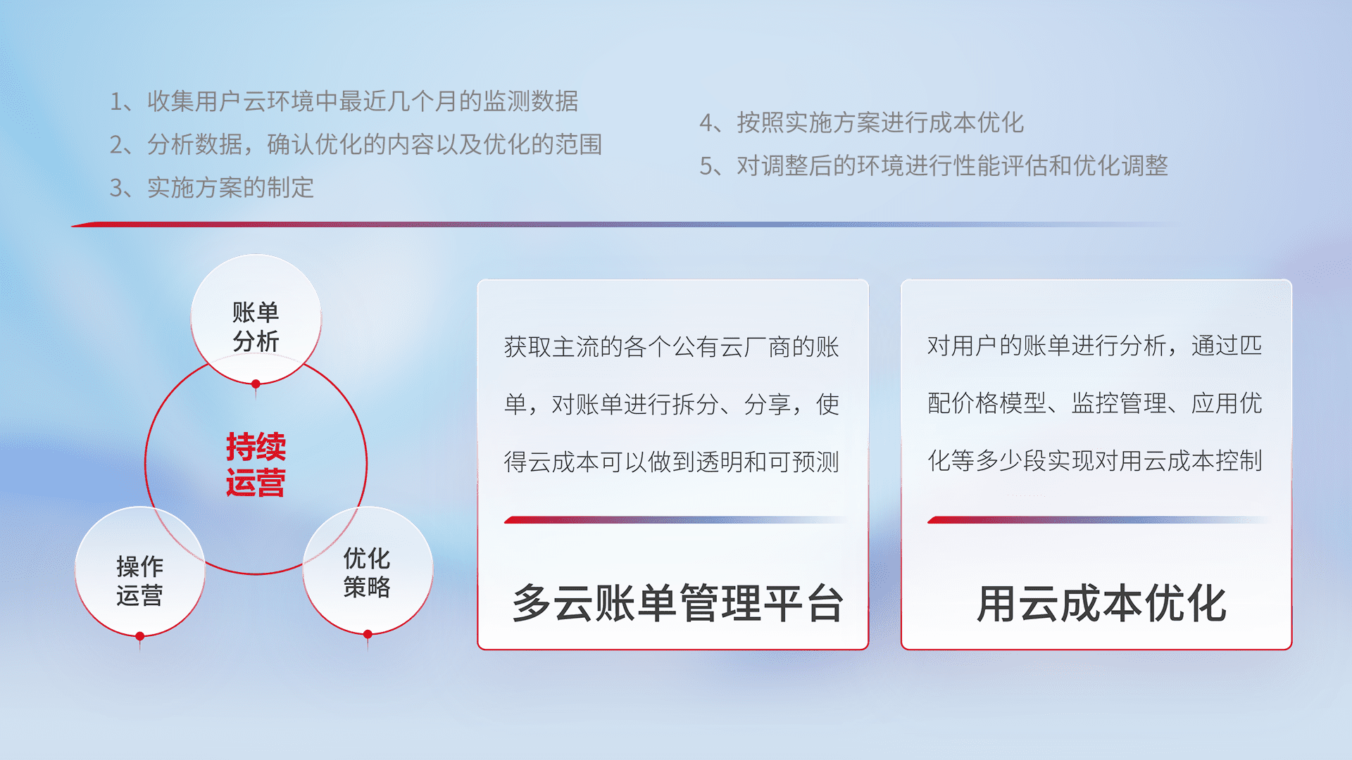 通过多云纳管,,,,以统一的资源数据模型把客户的云资源进行抽象和封装,,进而实现对多云资源的统一操作,,保障云资源管理的可靠性、、、稳定性与可用性。。。量身定制化运维内容,,,,配置、、、开发运维、、、补丁管理、、、备份、、监控、、、、认证和访问管理、、审计和日常巡检等,,,,保障在用云过程中的可靠度,,稳定度以及高可用率。。。